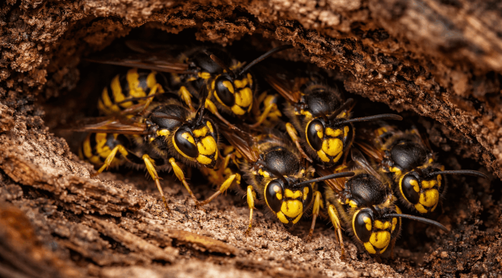 In the fall, fertilized wasp queens search for protected areas like attics, soffits, and wall voids to overwinter, often entering from the south and west side of structures where heat exposure is greatest. While they are typically inactive during winter, they can emerge in spring and start new colonies if not properly addressed.